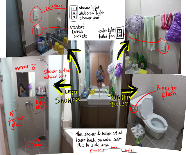 Upon stepping into the 'mini hallway' to your left is the bathroom area. On the wall on the toilet side there's a switch to turn on the main light (large one in the bedroom area, and the hall light (located in between bathroom and wardrobe). You can also turn on the air con here. Just press the button in an orange-y brown colour, unfortunately I still have yet to know how to lower the AC - the thing is entirely in Korean.